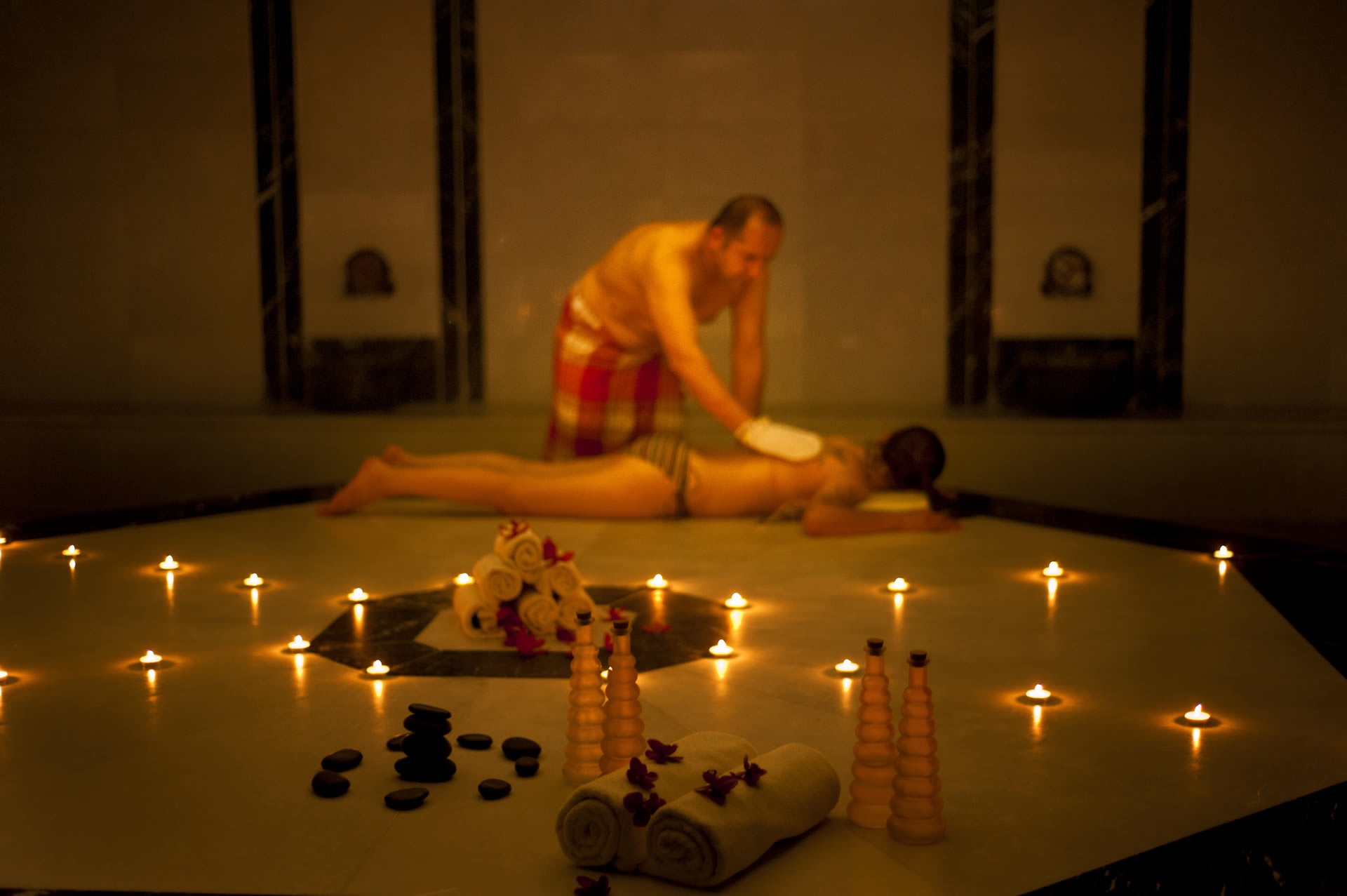 Programımızın ana kısmı size saunayı anımsatacak. Buharlarla dolu ve sıcak bir odada bir süre oturmanız ile başlayacaktır. Fakat kendisi bir saunadan çok daha fazlasıdır: Bu oda mermerden yapılmıştır. Merkezinde ısıtmalı mermer bir platforma, ve ayrıca yine mermerden yapılma çeşmelere de sahiptir. Egzotik görünümü sayesinde, oradaki dakikalar boyunca gözlerinizi de memnun edeceksiniz.